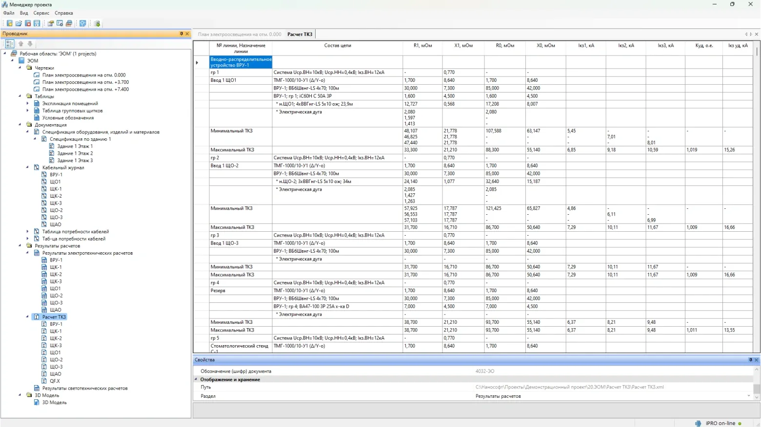 Расчет токов одно-, двух- и трехфазного короткого замыкания по методикам ГОСТ 28249- 93, «Петля фаза-ноль». Расчет кабеля на невозгорание согласно Циркуляру № Ц-02-98 (Э) Расчет токов утечки через изоляцию согласно ПУЭ-7, п. 7.1.83 Расчет падения напряжения.