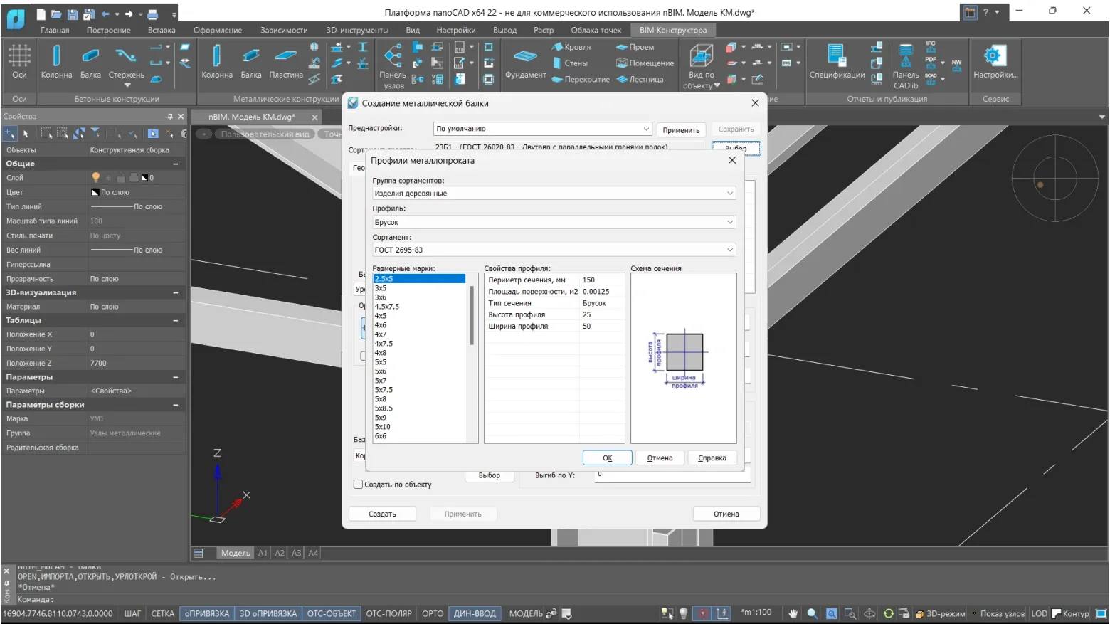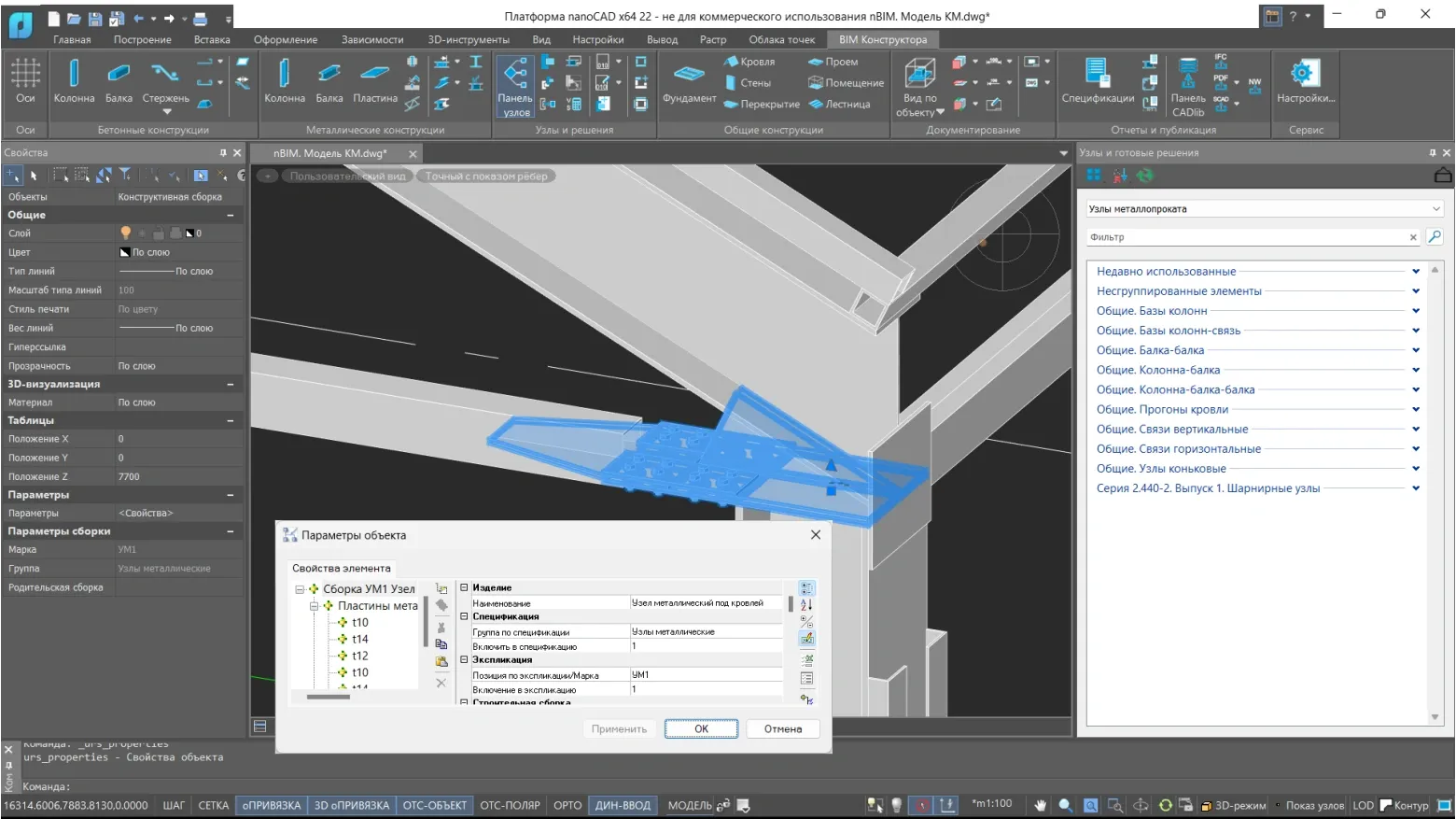 Создание металлических колонн, балок, пластин, болтовых и сварных соединений, а также параметрических узлов металлоконструкций.