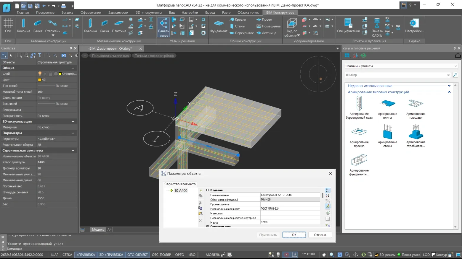 Создание железобетонных колонн, балок, выполнение армирования конструкций как в ручном, так и в автоматизированном режиме.