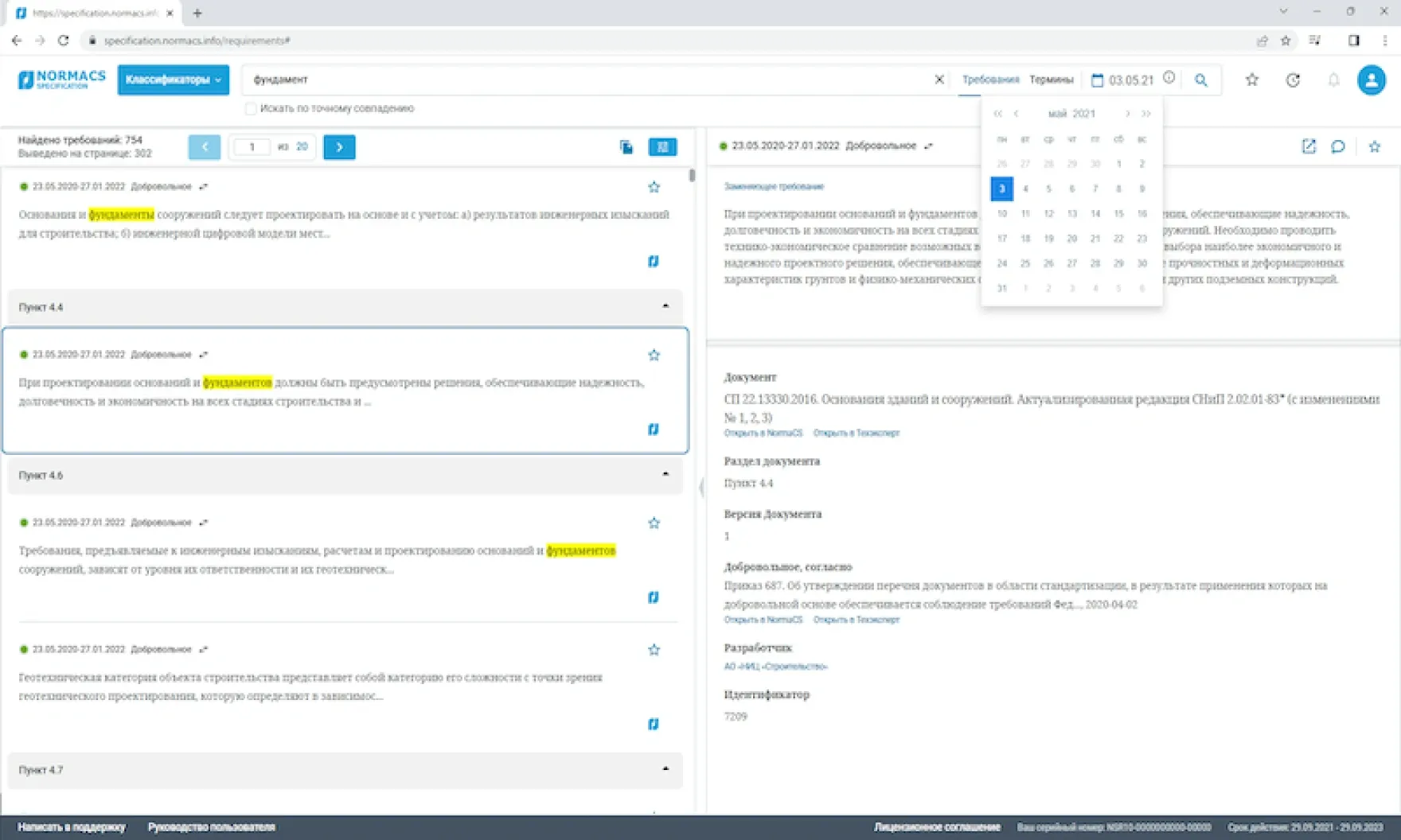 Поиск требований происходит с учетом даты выполнения проекта и показывает именно тот набор требований, который действовал на тот момент