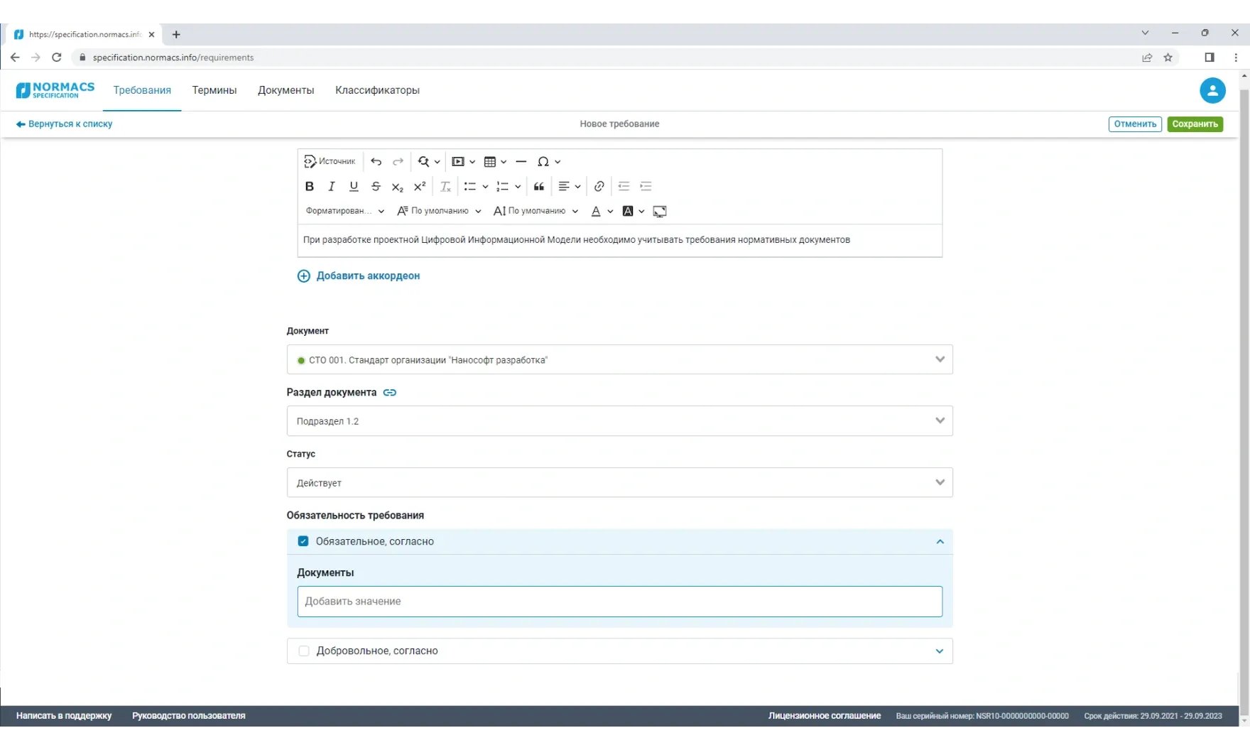 Каждое требование содержит все метаданные документа- источника, включая информацию о статусе, редакции, разработчике. Для обращения к полному тексту документа есть ссылка на системы NormaCS или «Техэксперт»