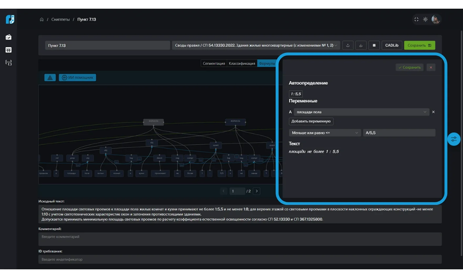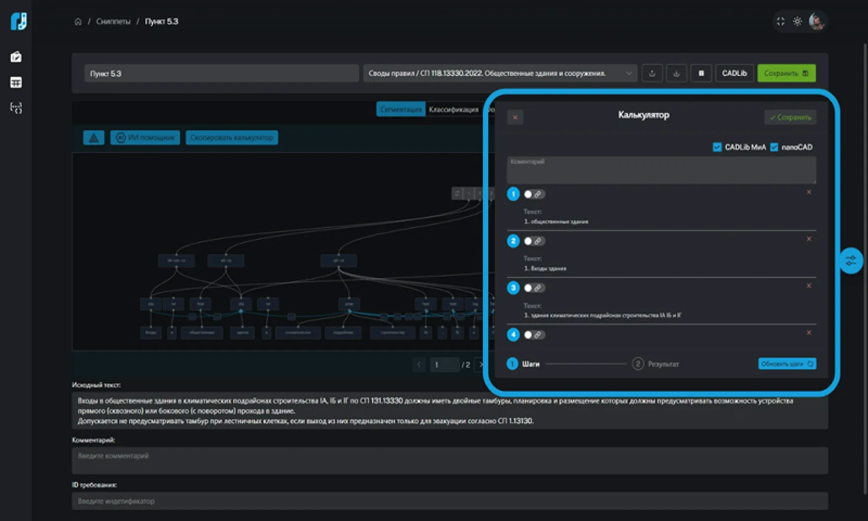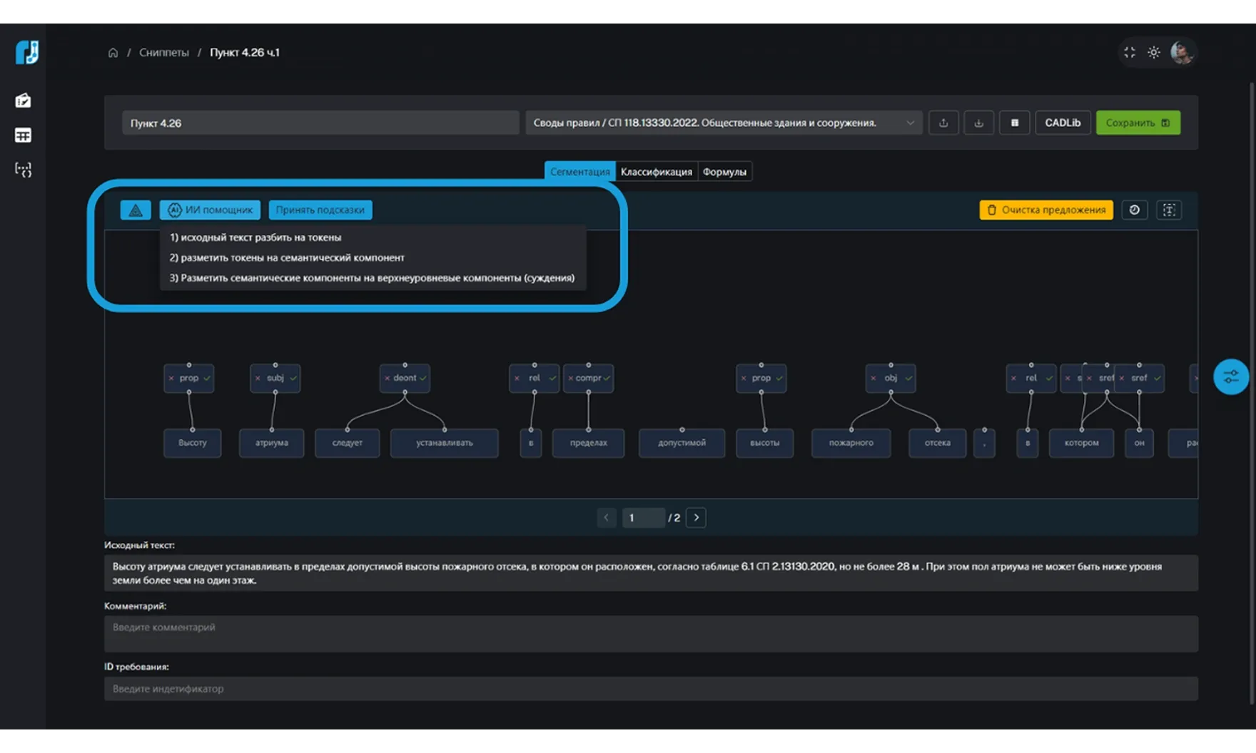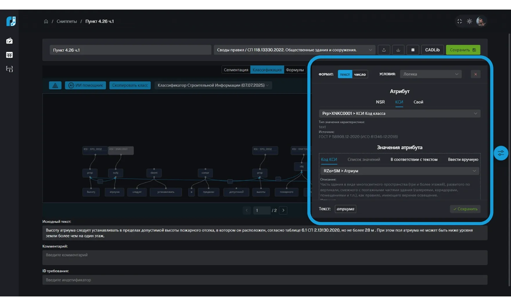 Разработан алгоритм сопоставления семантической разметки требований с логическими операциями отбора и проверки объектов ЦИМ в CADLib Модель и Архив, благодаря которому выгружаемые профили проверки точно соответствуют исходному тексту